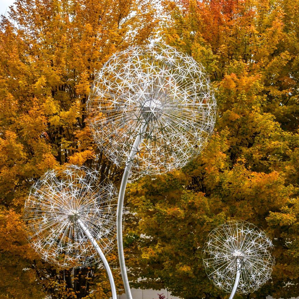 One of my favorite quotes is about dandelions: “Some see a weed; some see a wish.” This metal dandelion sculpture in downtown Coeur d’Alene is a favorite art piece in our hometown hamlet, a small city which does a great job of highlighting art and artists. Isn’t it lovely showcased in front of the beautiful colors of October?